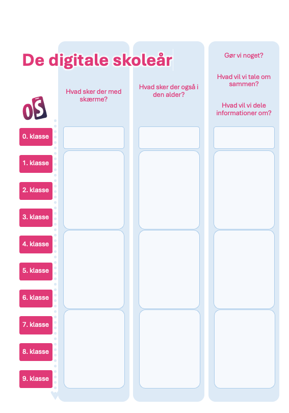 OS er et læringsforløb for 3-4 og 7-8. klasse, designet for at lærere og forældre kan få indblik i den side af deres børns/unges liv, hvor de er (eller snart bliver) online sammen. OS er fem lektioner, som hver uge fører videre til samtaler hjemme igennem Elevens Bog.