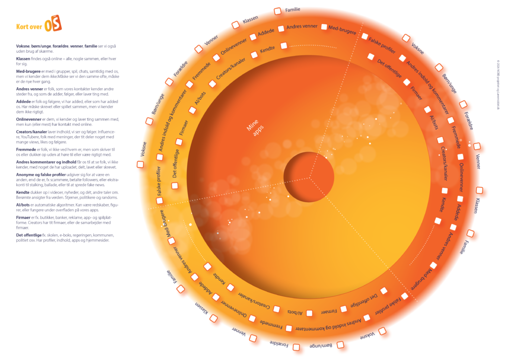 Afkrydsningsmulighederne er indrettet, så de yderste personer er dem, vi også kender ‘i den rigtige verden’ (fx fra skolen, fritiden eller familien). I det næste lag finder vi medbrugere, indholdsskabere på fx YouTube og andre mennesker, man kun “møder” gennem deres indhold og kommentarer. Inderst ses de fjerneste og mest abstrakte “andre” (fx firmaer og kendte). Der er en kort beskrivelse af hver type “andre” i siden af arket.
