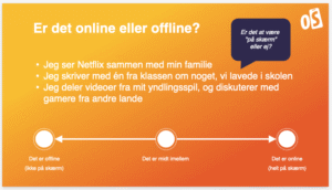 Efter quizzen følger et diskussionsslide med tre særtninger på en visuel skala. Er det online (på skærm), offline (ikke på skærm) eller et sted midt imellem?