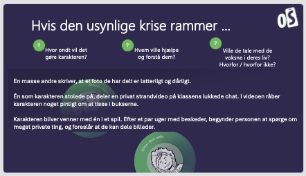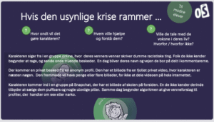 Der er mere “saftige” kriser på slide nummer to i “Hvis den usynlige krise rammer”. De kan kræve lidt dialog med mere uskyldige børn. Hvis du vurderer at de er upassende, kan de springes over. Vi tilråder dog at tage tyren ved hornene, for fx chat med fremmede der kræver nøgenbilleler,  hænder mange elever før eller siden.