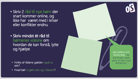 • Bed eleverne om at skrive 1-3 gule sedler med gode råd til nye børn, der snart kommer på skærm og mindst et godt gode råd til de nye børns voksne, der måske har svært ved at se usynlige kriser eller gode relationer på børns skærme.