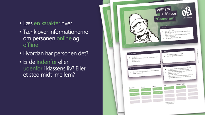 Eleverne læs på arkene, hvis I mangler svar. Nogle karakterer har fx god social støtte fra onlinevenner, svære familierelationer eller et uskyldigt hjerte, som kan påvirke, hvordan de ville reagere. Denne drøftelse kan også laves som gruppearbejde.